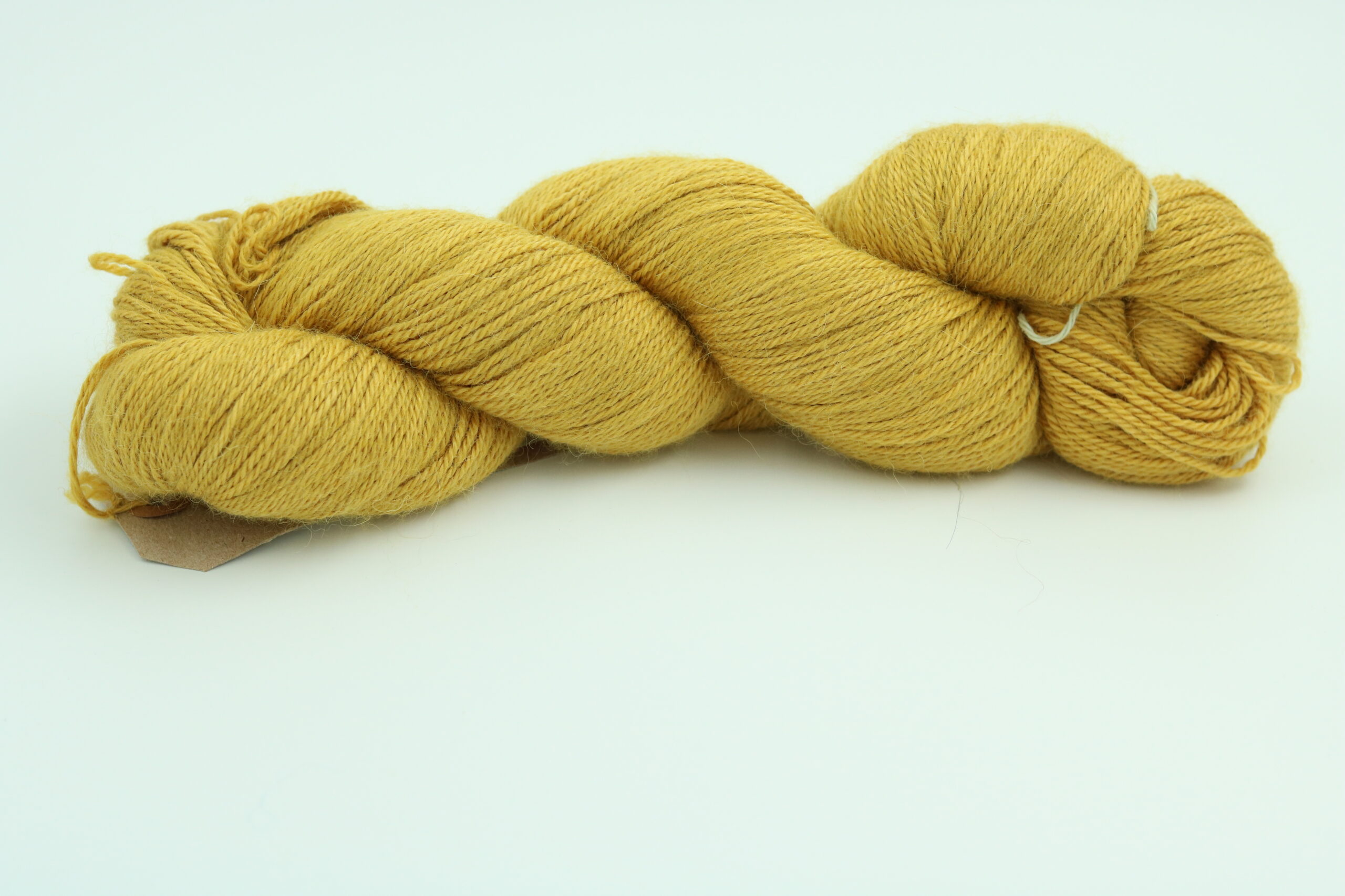 Den fineste 70 % Baby Alpaca, 20 % Morbær silke og 10% Cashmere – 400 m/100 gram – der her er farvet på birkeblade.
